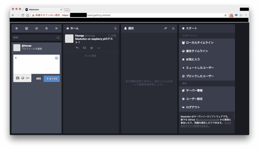 以前の記事では Docker を利用して mastodon しようかと考えていましたが、非力なラズパイで Docker を利用すると結構負荷がかかっている感があったので使わないことにしました。
