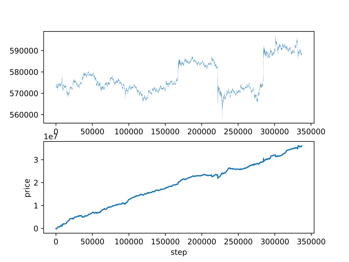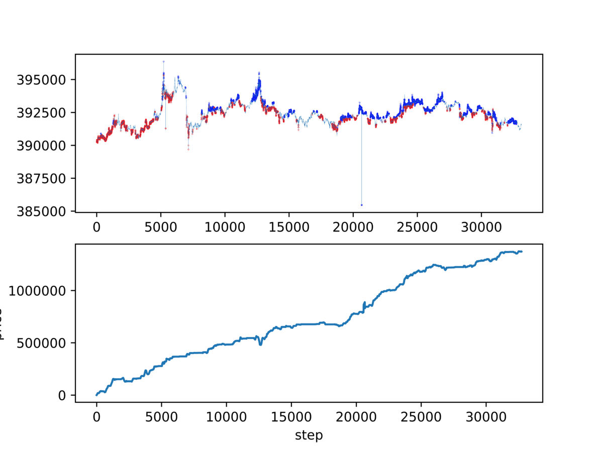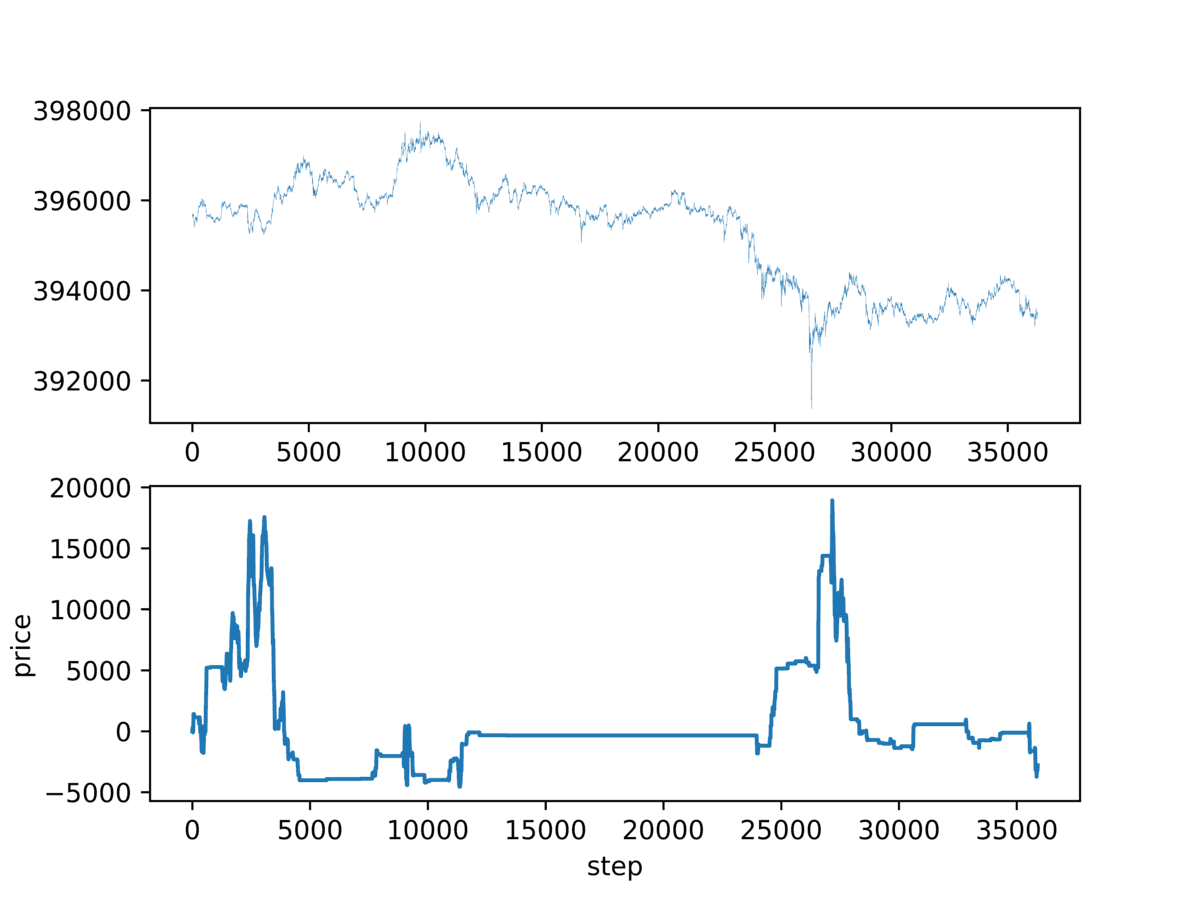 最初に載せたグラフは action を BUY/SELL の 2 択にして 1 秒毎 1 分先の価格予想した結果です。
